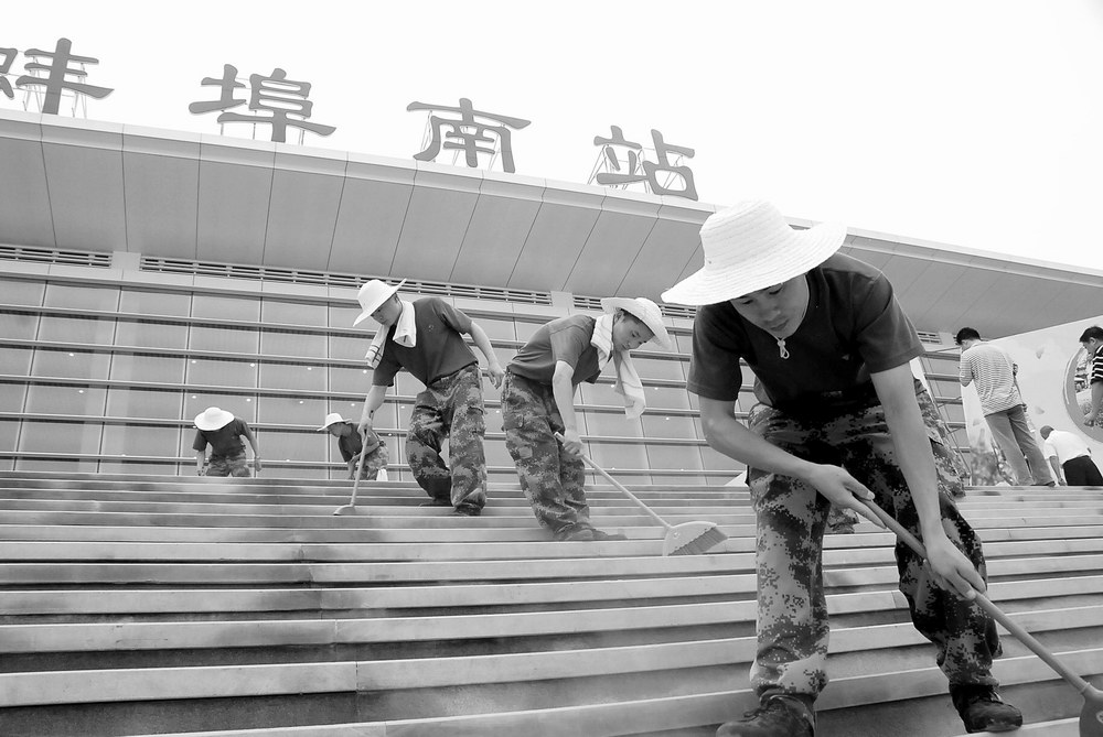 6月28日上午,解放軍汽車(chē)管理學(xué)院組織200余名官兵清掃高鐵蚌埠南站站前廣場(chǎng),為第二故鄉建設做貢獻。